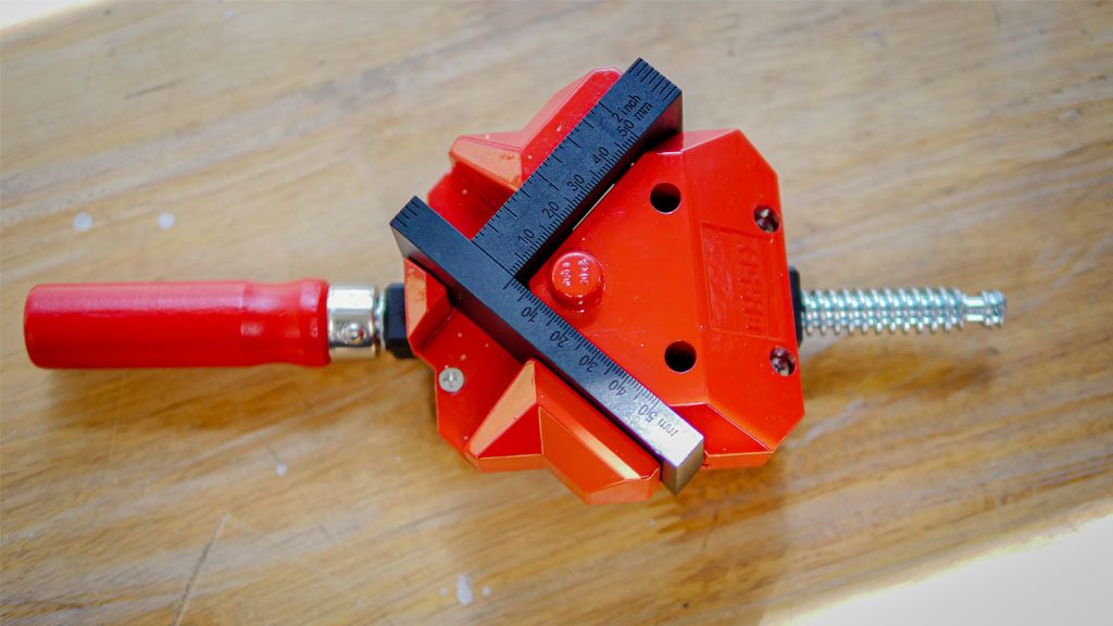แคลมป์เหล่านี้ใช้แรงกดผ่านหมุดเกลียวเหล็ก หมุนที่จับซึ่งขันแคลมป์ให้แน่นโดยยึดโครงเข้าที่ สามารถใช้แคลมป์เข้ามุมด้วยมือ หรือยึดกับโต๊ะทำงานเพื่อความมั่นคงยิ่งขึ้นนั่นเอง แคลมป์หนีบมุมมักจะใช้ในงานที่ต้องการมุมฉาก เช่น กรอบรูป ฯลฯ แคลมป์เหล่านี้ยังสะดวกสำหรับการยึดข้อต่อตุ้มปี่ (สองชิ้นที่มีปลาย 45 องศาจับกันเพื่อสร้างมุมฉาก), ข้อต่อตัว T (วัสดุสองชนิดที่ติดเป็นรูปตัว T) และข้อต่อก้น (วัสดุสองชิ้นติดอยู่ที่ด้านขวา มุมที่ปลายก้น)